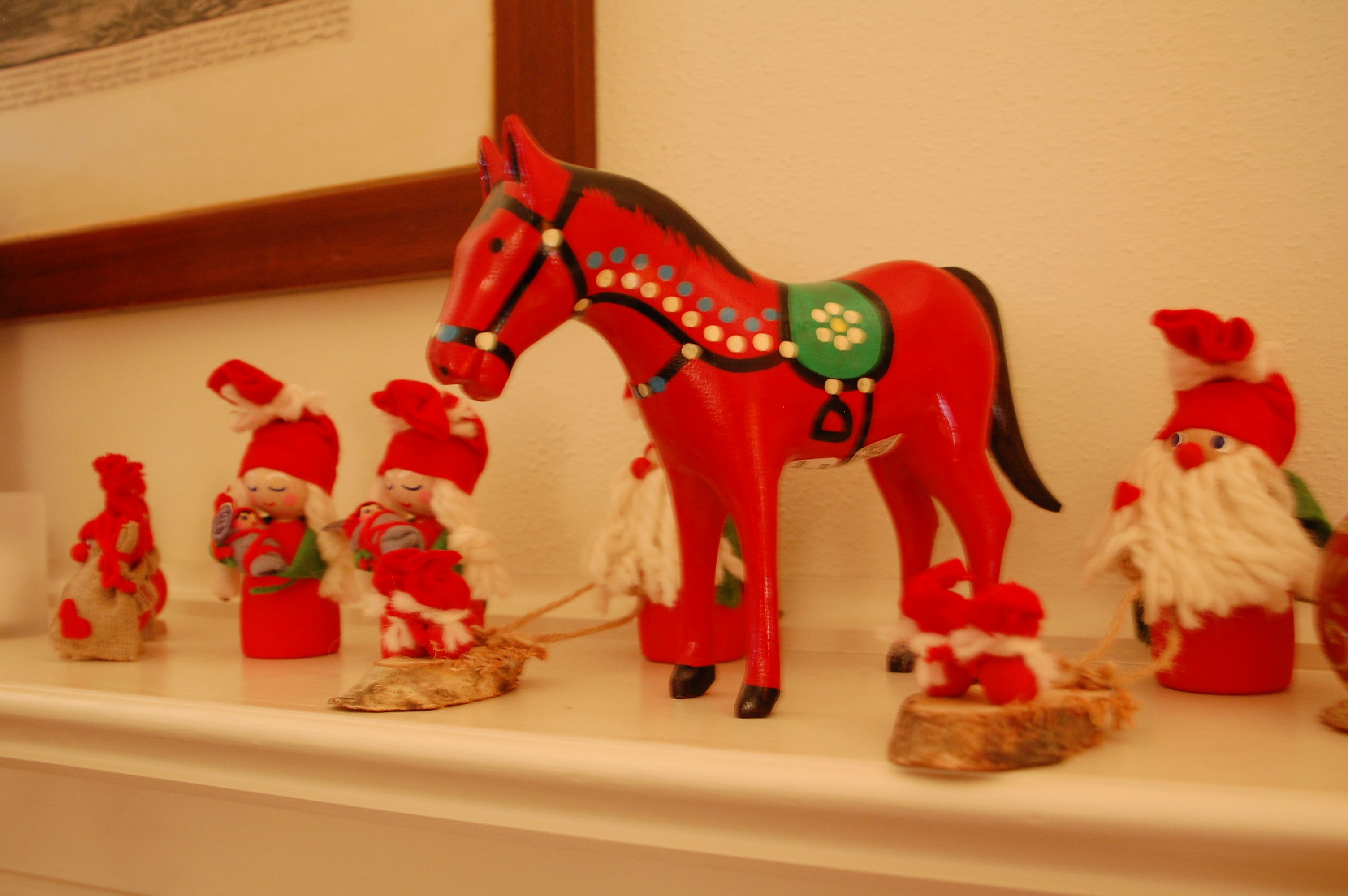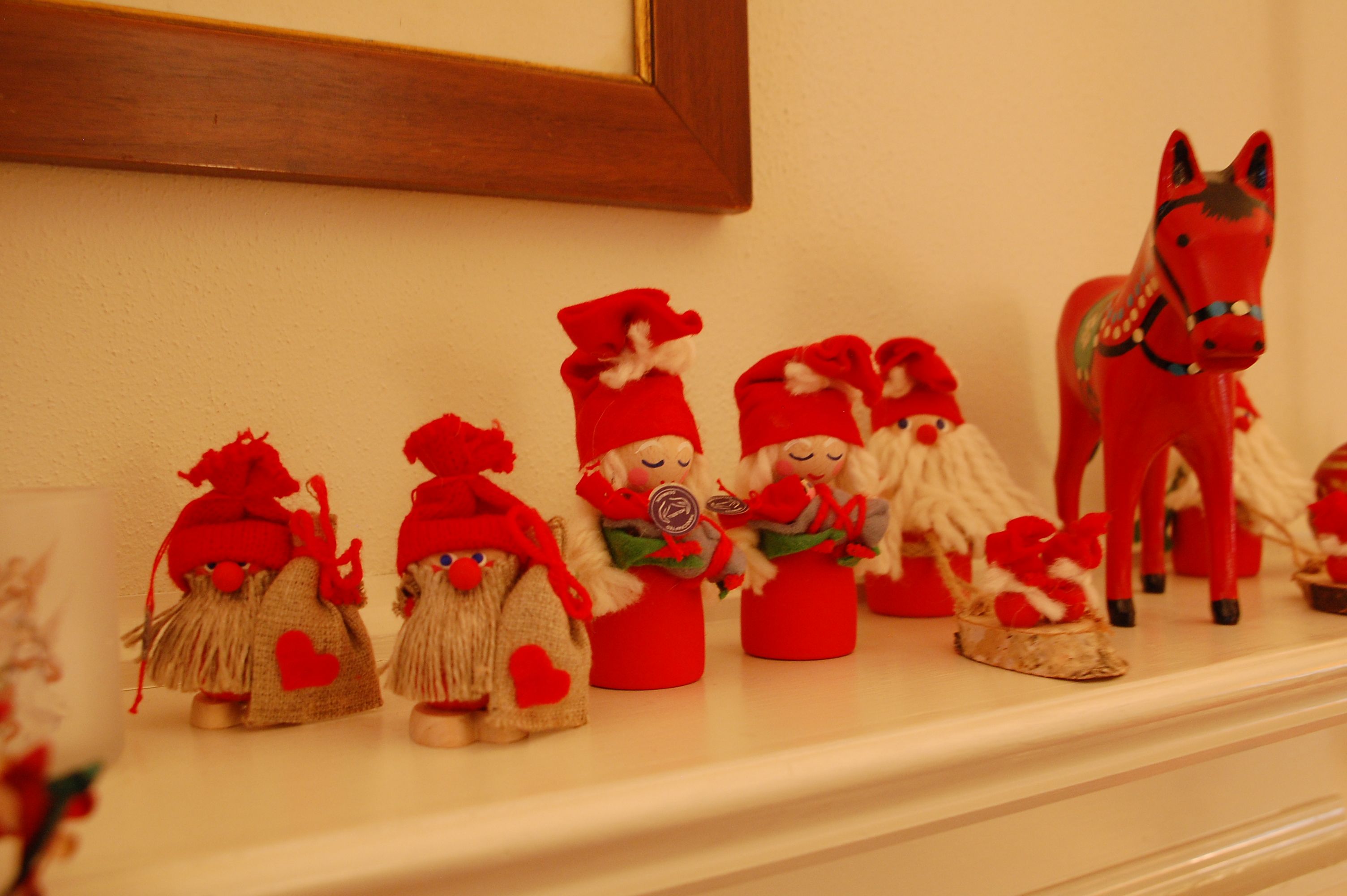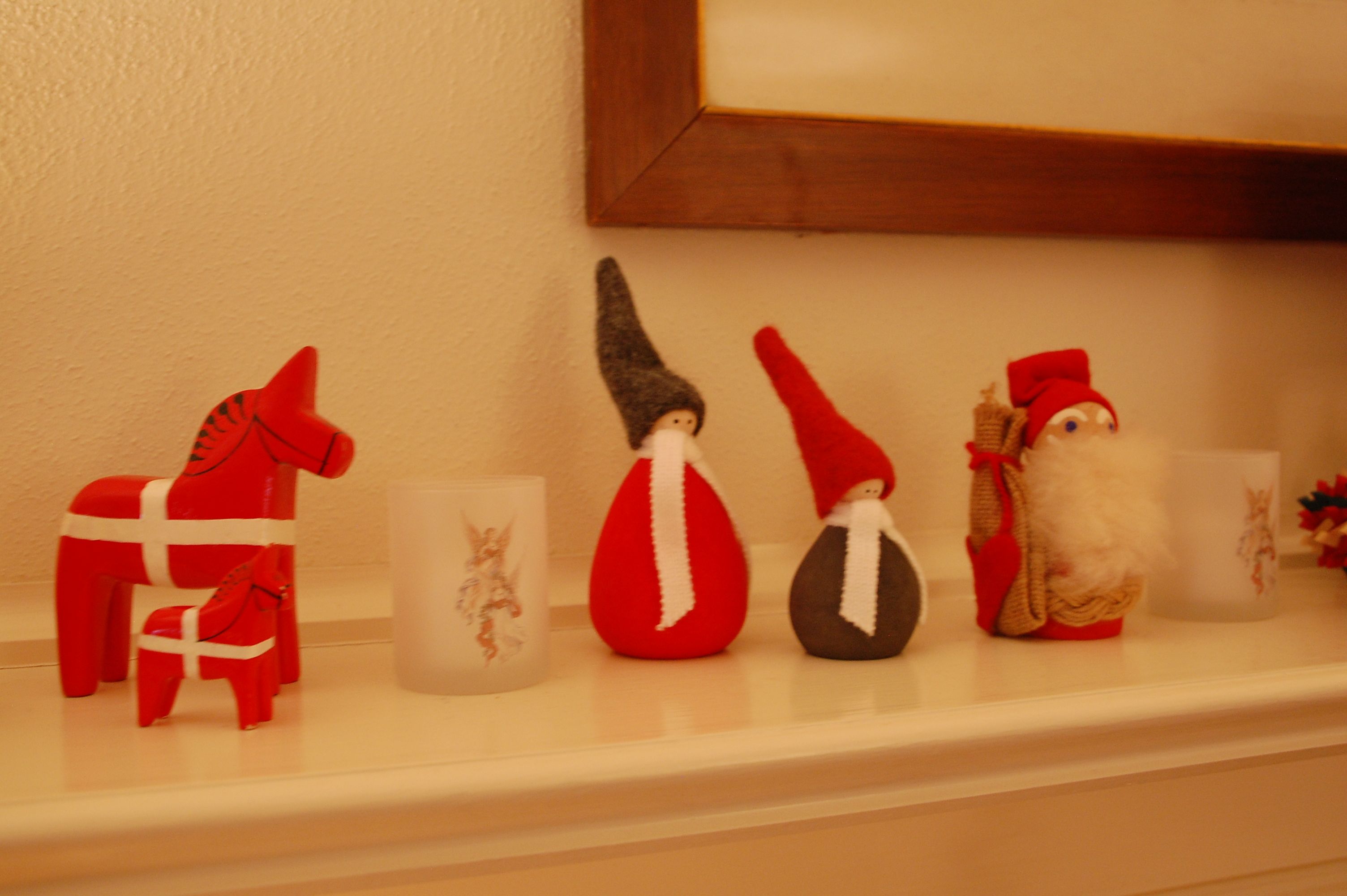 The two figurines with the tall hats are my favorite Swedish ornaments, purchased at the Christkindlmarket in Chicago, Illinois.