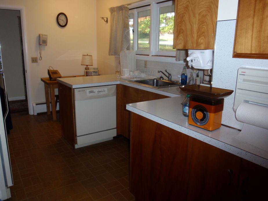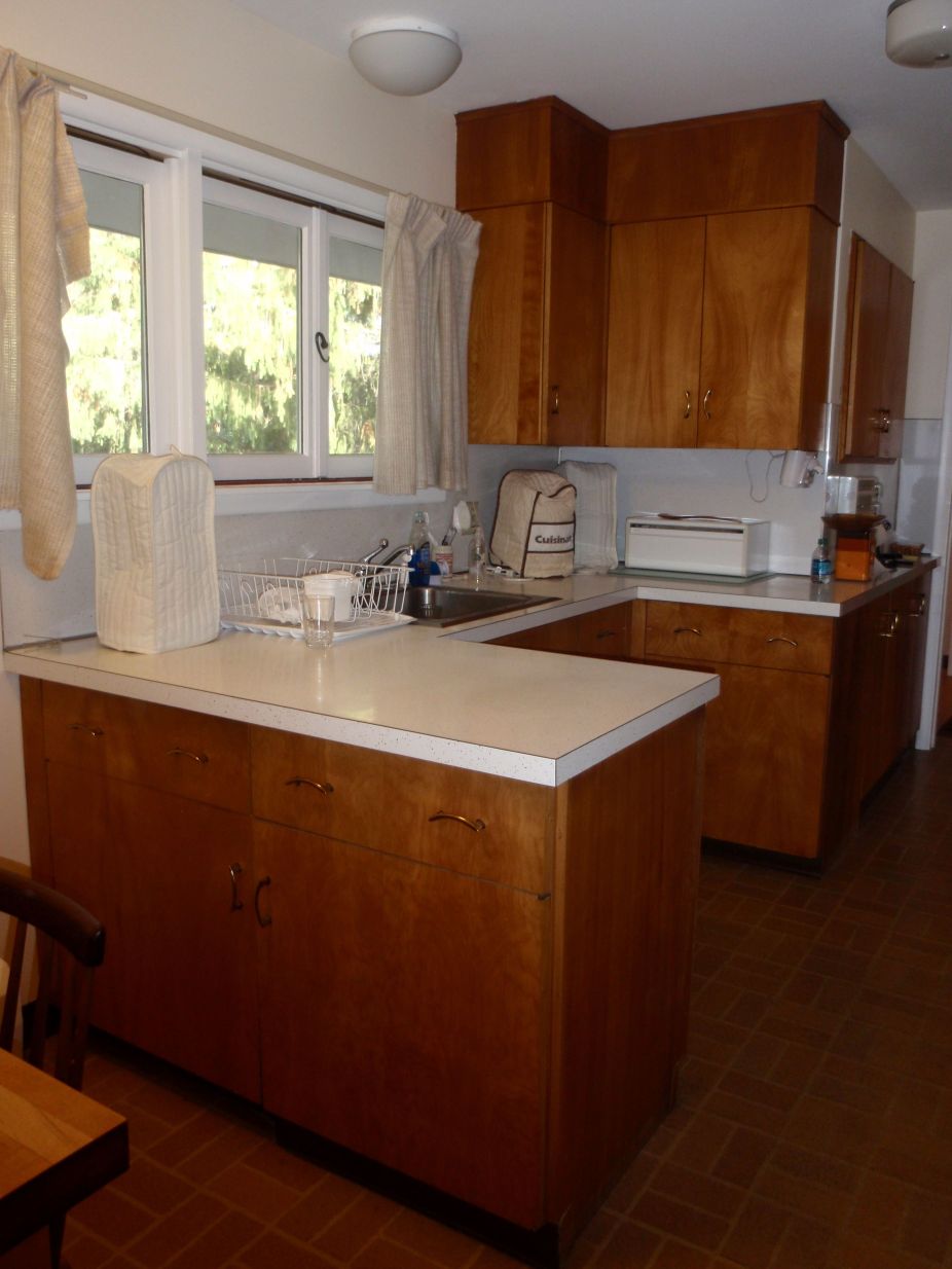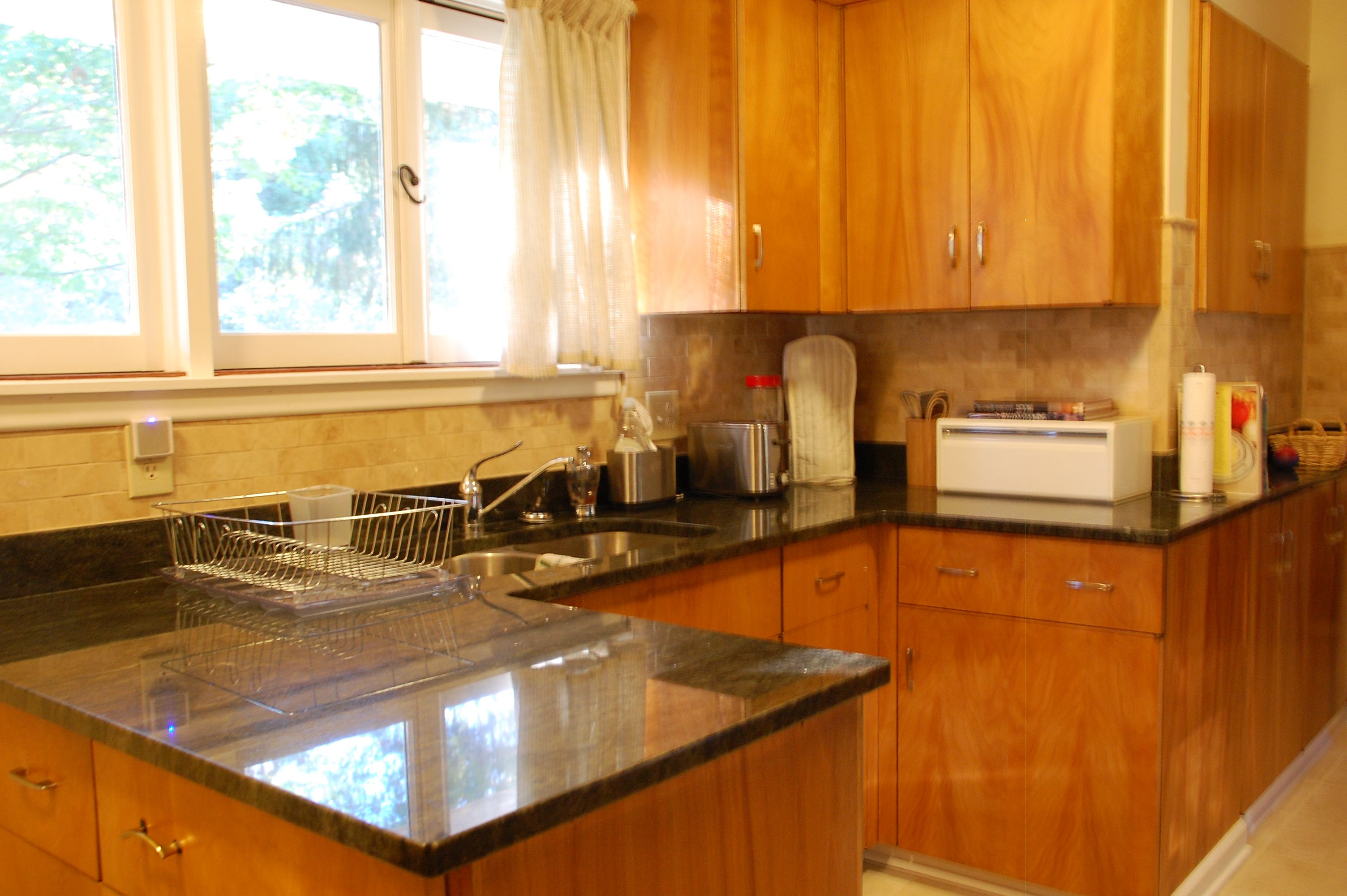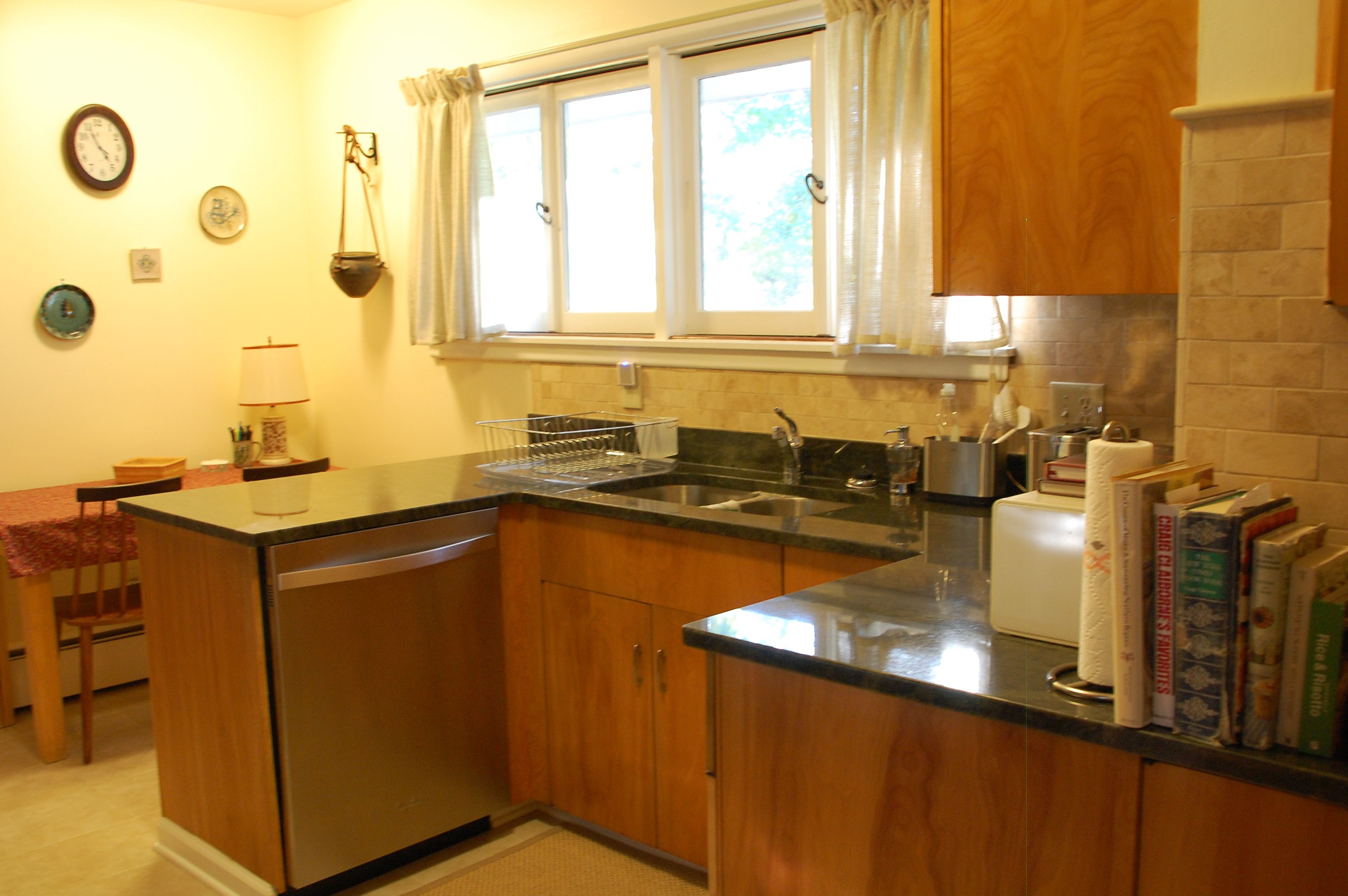 When I moved there the house was outdated for sure, so doing some renovations was a no-brainer. Some, in fact (like the primary bathroom), had to be done out of necessity because the floor boards were rotting and we felt as though the floor would fall from under us any day. So that was the first major project and it was a total gut. Next up was painting almost every room, which hadn’t been done in decades. In the dining it involved removing the dark brown grass wallpaper (which made the room feel so dark and small), and painting it white. We also replaced the linoleum tile floor with a pretty laminate wood floor. We then gutted the small powder bath. In the kitchen we put a new tile floor in, new granite countertops, a new tile backsplash, new stainless steel appliances, a new sink and faucet, and new hardware on the cabinets. The cabinets are not in perfect shape, but I actually love the stain on them, which goes perfectly with the mid-century modern style of the house. Two bedrooms in the walk-out basement got new laminate wood floors, and we put new berber-like carpet in the family room in the basement. On the exterior, a new roof was put on, and some landscaping was done, like taking out trees and bushes in the backyard to improve the view of the mountains.