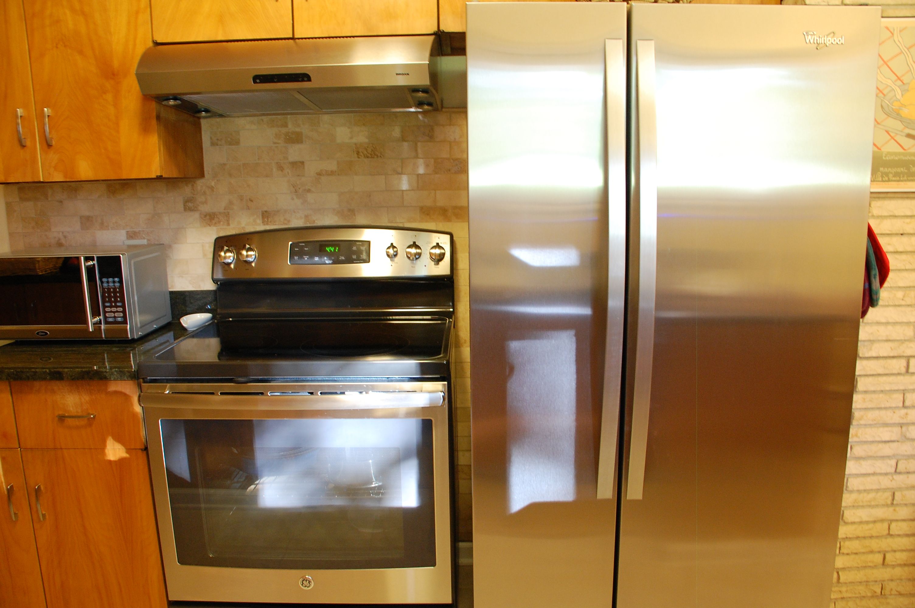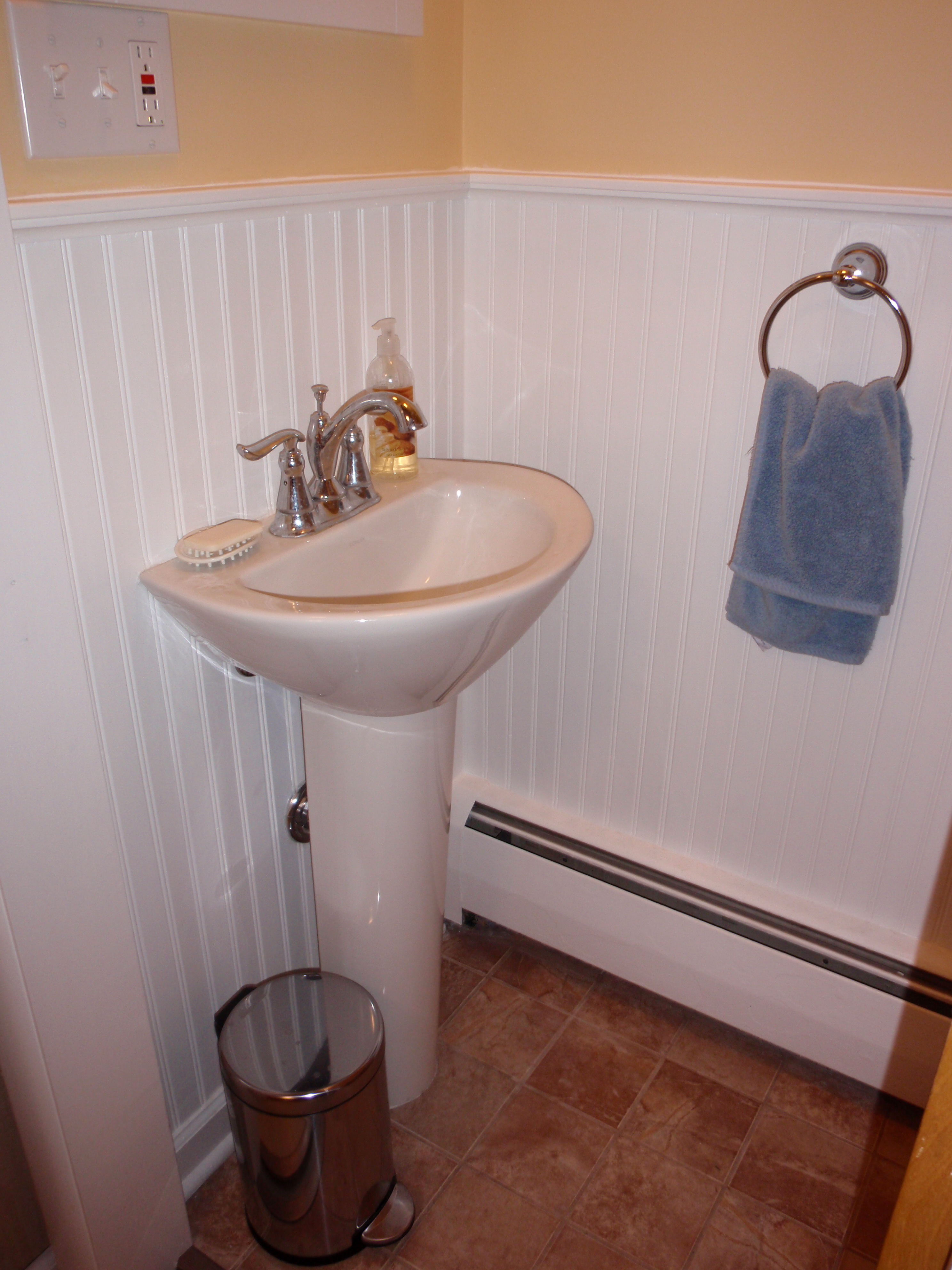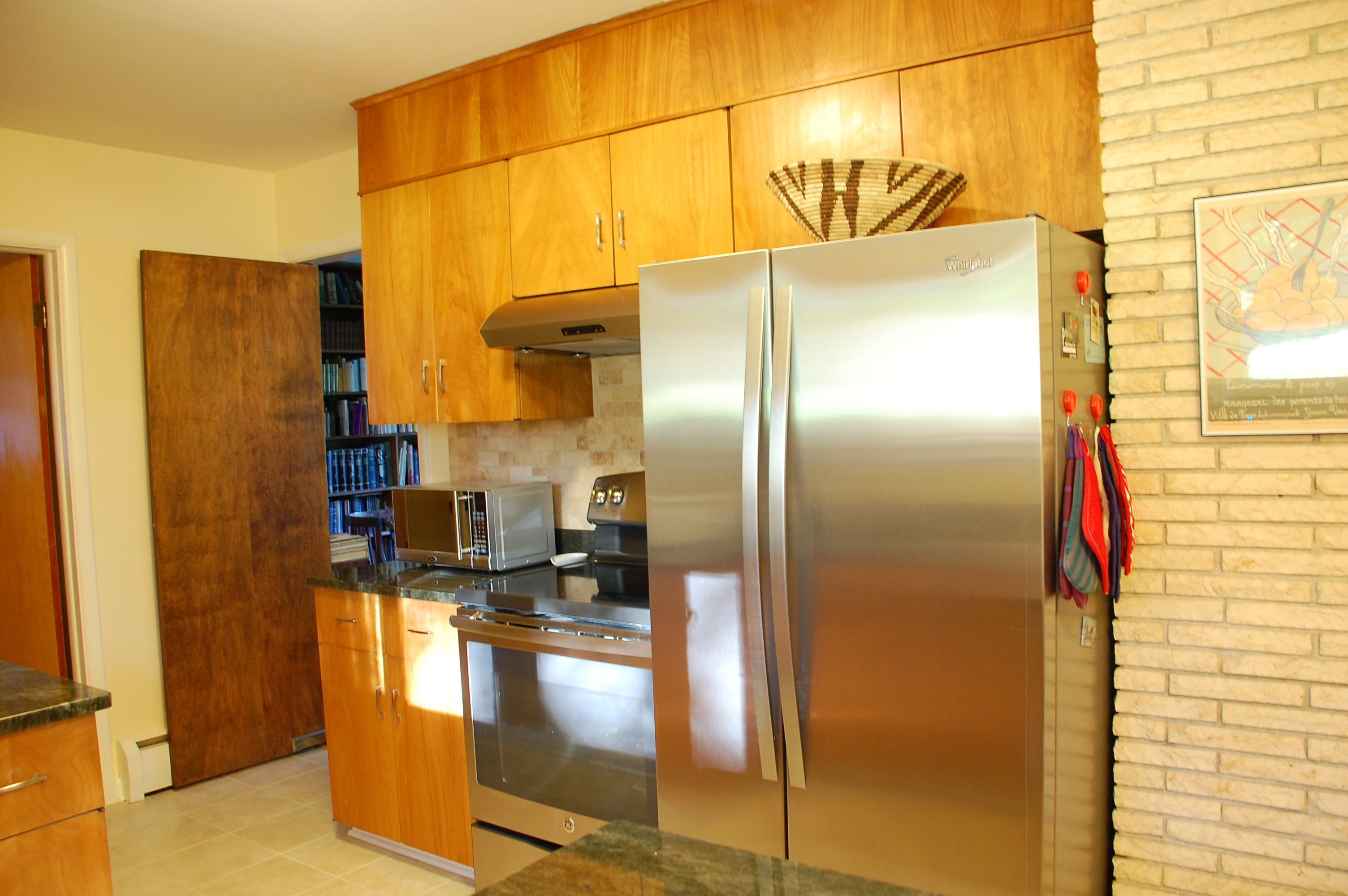 When I moved there the house was outdated for sure, so doing some renovations was a no-brainer. Some, in fact (like the primary bathroom), had to be done out of necessity because the floor boards were rotting and we felt as though the floor would fall from under us any day. So that was the first major project and it was a total gut. Next up was painting almost every room, which hadn’t been done in decades. In the dining it involved removing the dark brown grass wallpaper (which made the room feel so dark and small), and painting it white. We also replaced the linoleum tile floor with a pretty laminate wood floor. We then gutted the small powder bath. In the kitchen we put a new tile floor in, new granite countertops, a new tile backsplash, new stainless steel appliances, a new sink and faucet, and new hardware on the cabinets. The cabinets are not in perfect shape, but I actually love the stain on them, which goes perfectly with the mid-century modern style of the house. Two bedrooms in the walk-out basement got new laminate wood floors, and we put new berber-like carpet in the family room in the basement. On the exterior, a new roof was put on, and some landscaping was done, like taking out trees and bushes in the backyard to improve the view of the mountains.